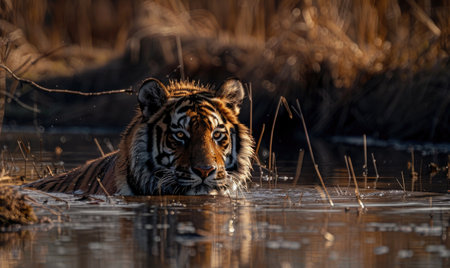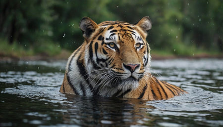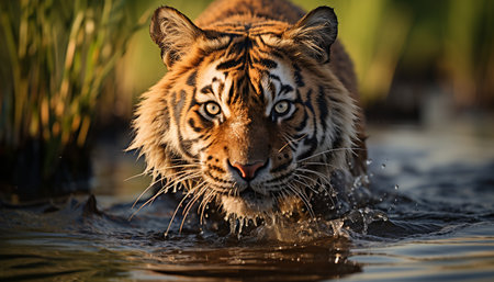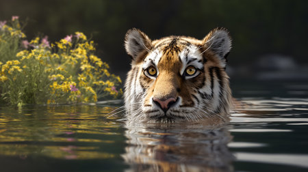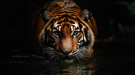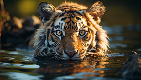 This striking close-up captures the intense gaze of a tiger partially submerged in water. The rich colors and detailed fur highlight the beauty and majesty of this magnificent animal in its natural habitat. ai generated.