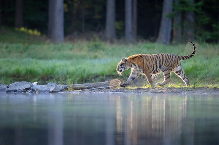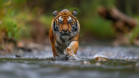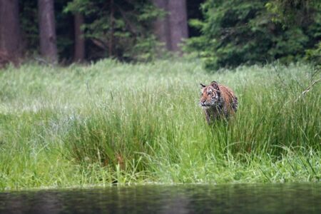 The Siberian tiger (Panthera tigris Tigris), or Amur tiger (Panthera tigris altaica) in the forest walking in a water. Tiger with green background.