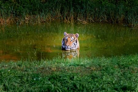 Panthera yellow with black stripped tiger swimming in river looking somewhere with copy space