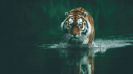A powerful tiger with striking orange and black stripes, its eyes fixed forward, as it wades through dark, reflective water, creating a dramatic and captivating scene.