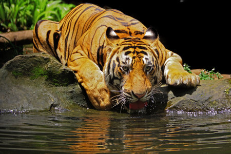 A Bengal tiger is pictured drinking water from a pond. The image features the animal with its distinctive orange and black stripes reflected in the clear water. Lush greenery and rocks form the backdrop, under natural light creating a serene environment. Suitable for wildlife publications and environmental projects.