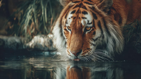 A majestic tiger drinks from a body of water in this image. The scene displays warm colors and natural textures with the animal's reflection visible. It suggests a daytime environment with low lighting. Suitable for use in wildlife publications, educational materials, or environmental campaigns.
