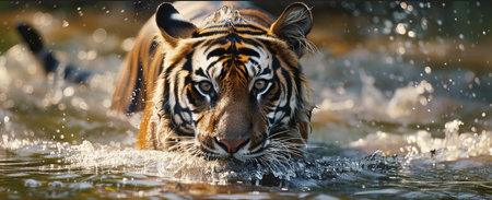 Aggressive tiger with water splashes looking at camera. Dangerous angry striped animal in water. Big wild predator posing a threat. Generative AI