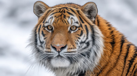 This captivating portrait of a tiger in a snowy landscape highlights its striking features and radiant fur. A perfect representation of nature's beauty and strength.