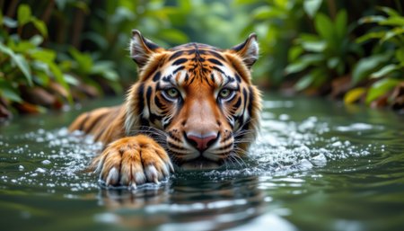 A closeup of swimming tiger in natural water body surrounded by green foliage, showing intense focus and power