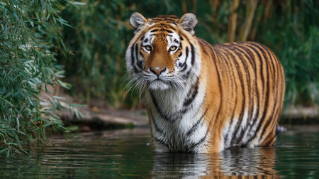 A majestic tiger stands partially submerged in tranquil water, Majestic Tiger Standing in Tranquil Water