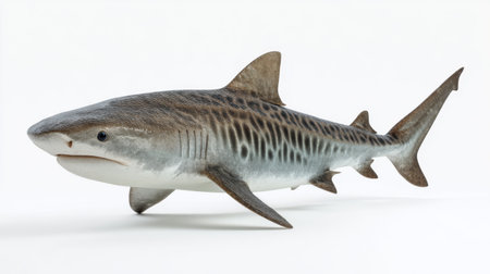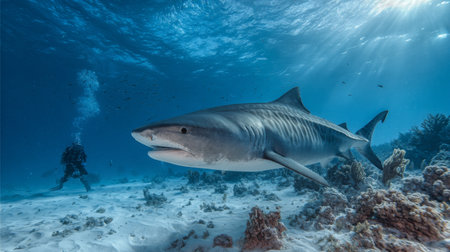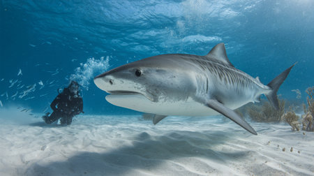 Divers encounter a majestic tiger shark during an underwater expedition. A captivating scene of wildlife.