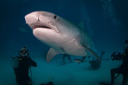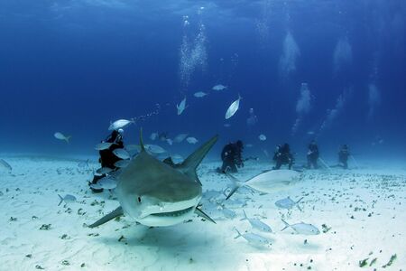 Tiger Shark Approaching over Sand Bottom, Divers in the Background. Tiger Beach, Bahamas