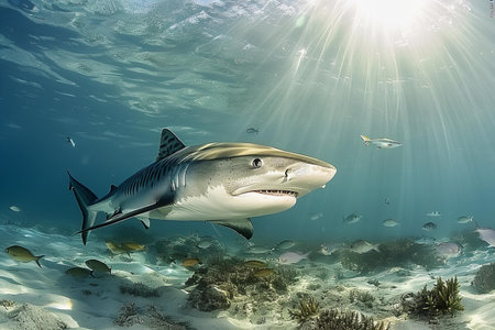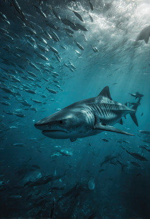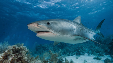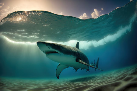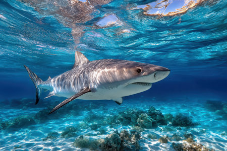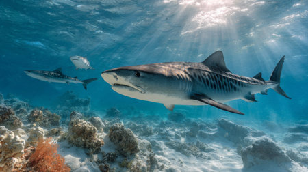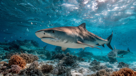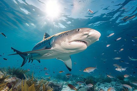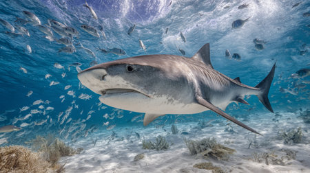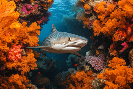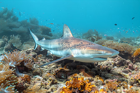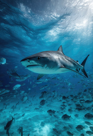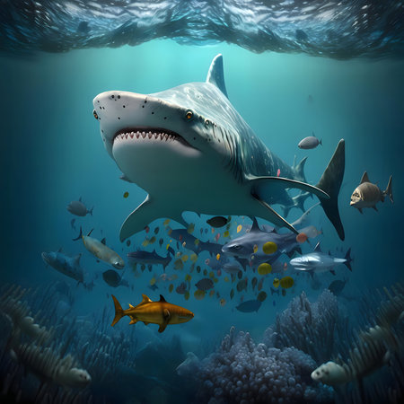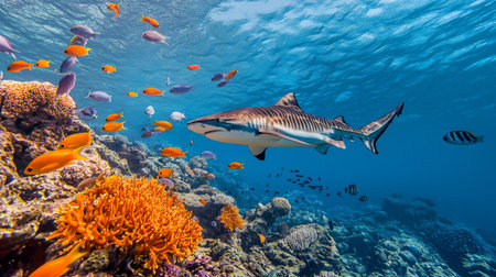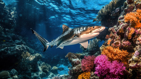 A great shark swims gracefully amidst a vibrant coral reef, surrounded by diverse fish species. This digital underwater image depicts the beauty and power of marine wildlife