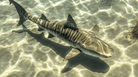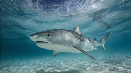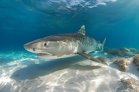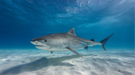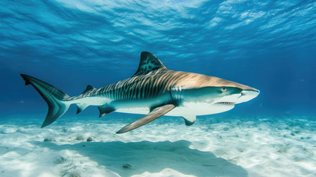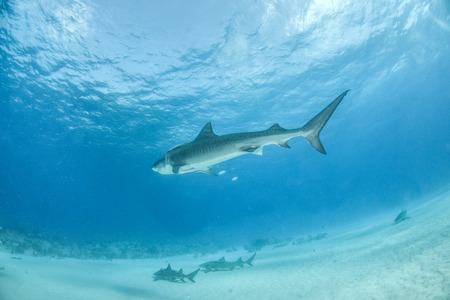 Tiger shark (Galeocerdo cuvier) swimming in the shallow sand banks, north of the Bahamas
