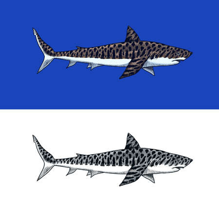 Great Tiger shark. Marine predator requiem animal. Sea life. Hand drawn vintage engraved sketch. Ocean fish.