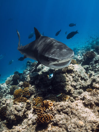 Tiger Shark eating fish in blue ocean on coral reef.
