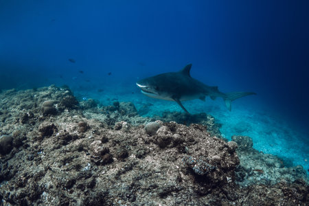 Tiger shark on deep in blue ocean. Shark with sharp teeth. Diving with dangerous tiger sharks.