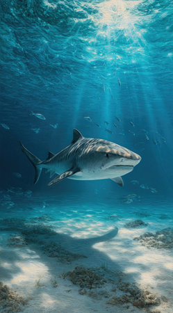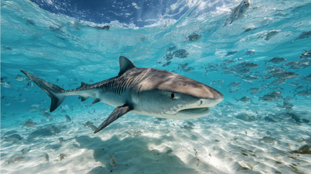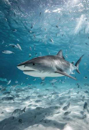 A powerful shark swims gracefully in vibrant blue waters, surrounded by smaller fish. The underwater scenery showcases a serene aquatic environment, highlighting marine life.