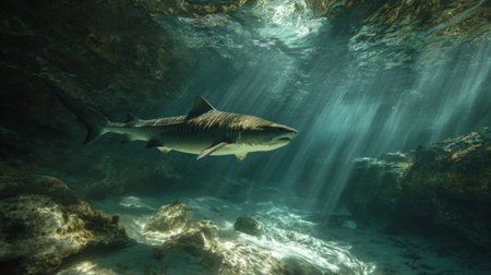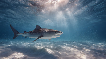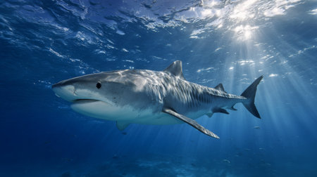 Underwater view of a shark swimming in the blue ocean with rays of light