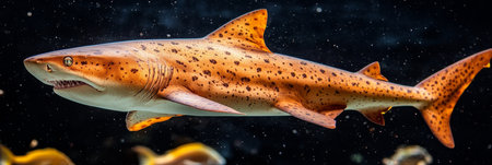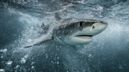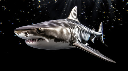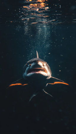 Vivid underwater photography of a fierce glowing shark in the dark depths of the ocean
