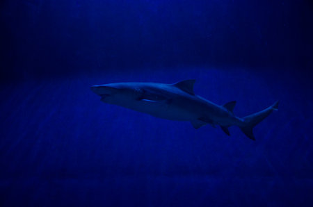 Shark swimming in a dark blue water tank. Aquarium.