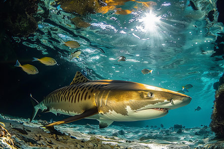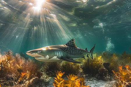 A stunning shark glides through an underwater landscape filled with sea plants and rocks, illuminated by sunlight.