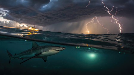 Dramatic shark emerges from ocean during a lightning storm