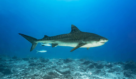 Picture shows a Tiger shark at the bottom of a tropical sea.