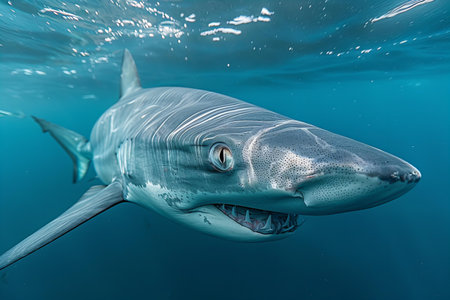 Great White Shark (Carcharodon carcharias) swimming in blue water