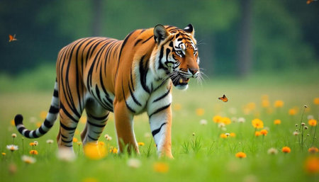 Tiger walking through field of wildflowers with butterflies flying