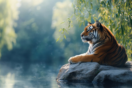 A regal tiger lies comfortably on a rock, calmly gazing over a peaceful river in the morning light.