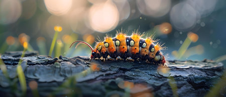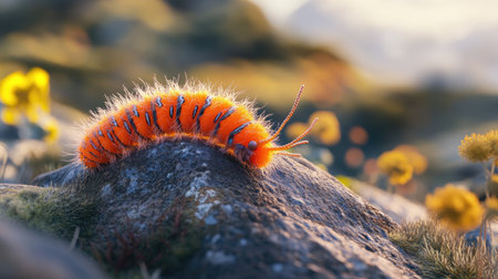 A stunning macro shot capturing a caterpillar slowly crawling on a rock, with a picturesque sunset illuminating the scene. This image embodies the beauty of nature.