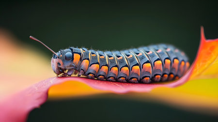 Colorful caterpillar on a green plant, showcasing vivid patterns and textures against a blurred natural background