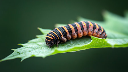 A striking close-up of a vibrant caterpillar with bold stripes resting on a green leaf. The image captures the intricate details of this fascinating insect in a serene outdoor setting.