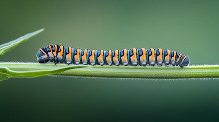 Striped caterpillar crawls on green plant outdoors generated by artificial intelligence