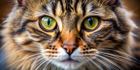 A detailed close-up shows a tabby cat with striking green eyes. The cat is alert, with an open mouth suggesting surprise. The image features a shallow depth of field, emphasizing the cat's face, complemented by warm tones. It is suitable for various commercial purposes and can be utilized in editorial content.