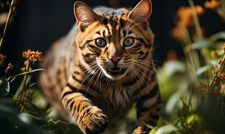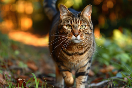 - Capture the tranquility of nature with this serene image of a cat nestled amidst golden sunset leaves- A glimpse of feline curiosity and peaceful contentment in the warm embrace of the setting sun- The perfect shot for animal lovers and nature enthusiasts seeking a touch of tranquility to adorn their walls- A magical moment frozen in time, showcasing the beauty of the natural world and the gentle spirit of its inhabitants- A serene escape into the heart of nature, where a curious feline companion invites you to share in its peaceful sanctuary AI Generative