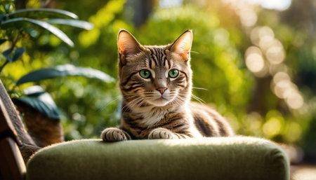 Curious domestic cat gazing intently with alert expression in natural outdoor setting with blurred green vegetation background Adorable fluffy feline pet posing in candid moment