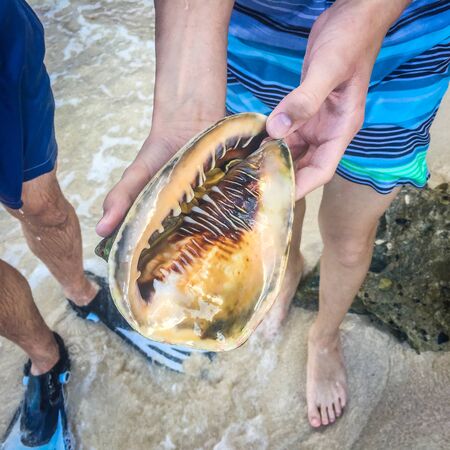 Person holds big tropical sea shell
