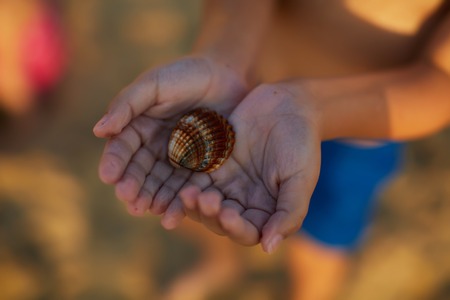 Scallop shell on the sand at sunset. Selective focus.
