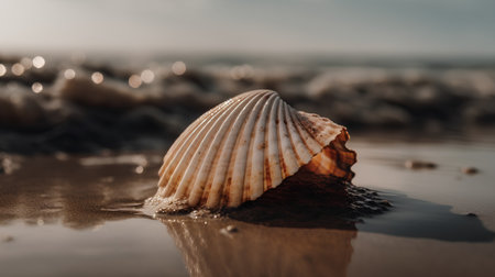 Seashell on sandy beach under sunlight, close-up macro. Natural coastal beauty concept.