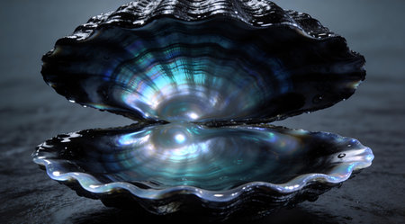 Luxurious digital artwork featuring intricate nacreous textures, dark opulent luster, and subtle underwater-like glow evoking high-end elegance. Ideal for luxury branding, jewelry design elements, premium packaging, sophisticated wallpapers, and marine-inspired graphics. Appeals to fashion, cosmetics, and interior design sectors seeking premium visual assets. . AI-generated digital illustration. AI-generated illustration.