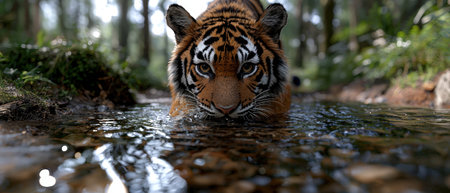 A tiger wading through a shallow stream in a forest.