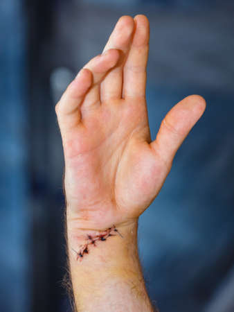 fresh scar on the wrist after tendon and nerve surgery