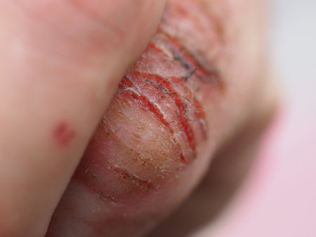 Woman's hand showing scarred, healing knuckles and dry textured skin, wearing a silver ring; close-up emphasizes injury, recovery and dermatological condition care
