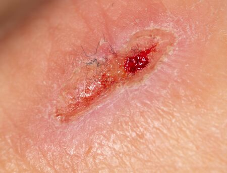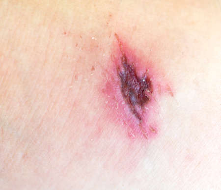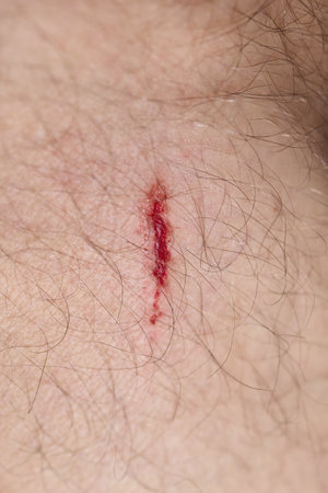 A wound from a knife cut on a person’s skin. Macro