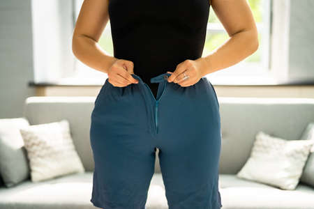 A person is attempting to button up tight jeans as they face challenges with weight gain in a well-lit environment.