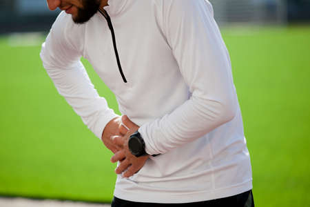 One caucasian woman from behind holding sore lower back while exercising outdoors. Female athlete suffering with painful spine injury from fractured joint and inflamed muscles during workout. Struggling with stiff body cramps causing discomfort and strain.