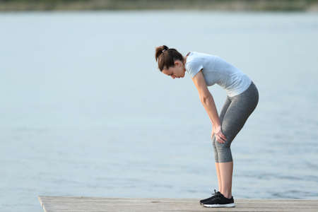 Side view portrait of a fatigued runner stopping and resting after sport in a lake pier