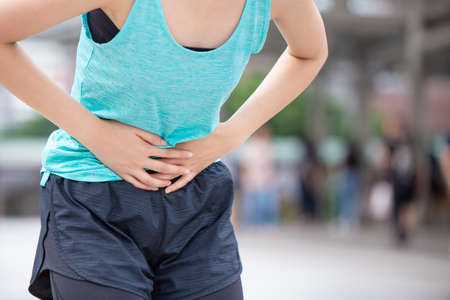 Young sport woman painful stomachache.Chronic gastritis. Abdomen bloating concept.women menstrual