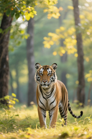 An AI generated illustration of A majestic tiger stands alert amidst a lush jungle setting, its watchful gaze pointed toward the camera