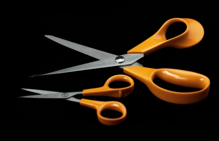 Three Orange, Yellow and Black Steel Scissors on Wood Background