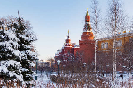 Moscow, Russia - February 01, 2018: Towers of the State Historical Museum on a blue sky background. Moscow in winter