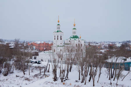 Panorama of a small city in the depths of Russia from a height. Orthodox churches and traditional old wooden houses, Kologriv and winter city view